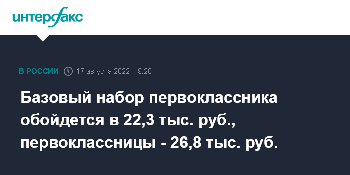 Москва. 17 августа. INTERFAX.RU - Росстат подсчитал, во сколько обойдется родителям собрать детей в школу в этом году. Так базовый "набор первоклассника", в который входят одежда и обувь, школьные и канцелярские принадлежности, обойдется родителям в 22 298 руб. 23 коп., если в первый класс идет мальчик, и в 26 838 руб. 47 коп., если речь идет о девочке.