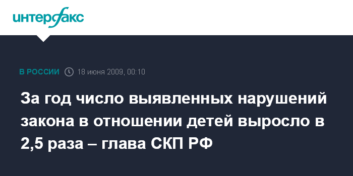 "За последний год общее количество выявленных нарушений закона в отношении детей выросло в 2,5 раза (почти 250 тысяч). Из них число нарушений в сфере образования выросло на четверть, в сфере занятости - на 17%, в области защиты семьи, материнства и детства - на 14%", - сообщил А.Бастрыкин в интервью газете "Известия", которое публикуется в четверг.