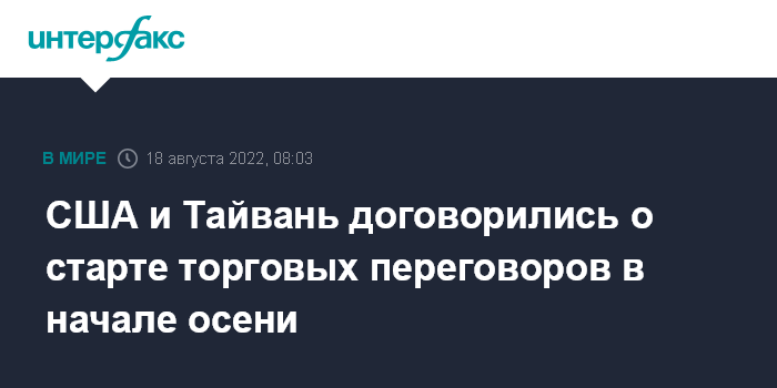 Москва. 18 августа. INTERFAX.RU - Соединенные Штаты и Тайвань в среду договорились осенью начать торговые переговоры в рамках новой торговой инициативы, заявив, что они хотят достичь соглашений с "экономически значимыми результатами", сообщают СМИ.