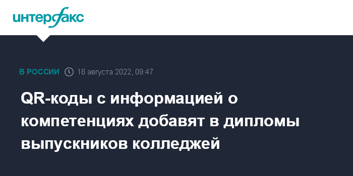 Москва. 18 августа. INTERFAX.RU - С марта следующего года организации среднего профессионального образования (СПО) будут добавлять в дипломы выпускников QR-коды, по ним будет доступна полная информация о компетенциях студента и практических навыках.