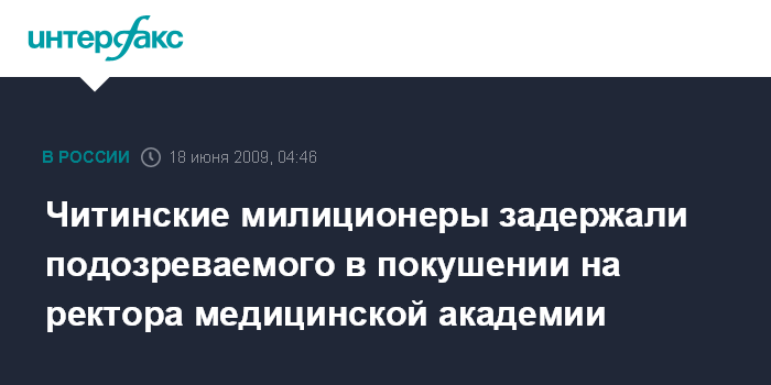 Чита. 18 июня. ИНТЕРФАКС-СИБИРЬ - В Чите задержан подозреваемый в совершении покушения на жизнь ректора медицинской академии Анатолия Говорина.