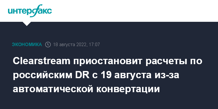 Clearstream приостановит расчеты по российским DR с 19 августа из-за автоматической конвертации