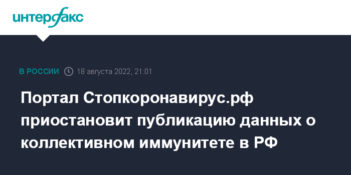 Москва. 18 августа. INTERFAX.RU - Портал Стопкоронавирус.рф приостанавливает еженедельную публикацию данных об уровне коллективного иммунитета в РФ к COVID-19, так как появление новых вариантов вируса требует пересмотра модели расчетов, говорится в сообщении, опубликованном на портале в четверг.