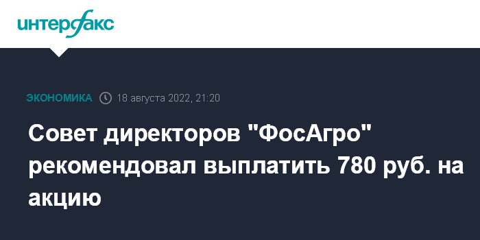 Москва. 18 августа. INTERFAX.RU - Совет директоров "ФосАгро" рекомендовал внеочередному собранию акционеров принять решение о выплате дивидендов из расчета 780 рублей на обыкновенную акцию, сообщила компания.