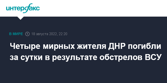 Москва. 18 августа. INTERFAX.RU - Четверо мирных жителей погибли, еще 23 пострадали в результате обстрелов территории ДНР с начала суток четверга. Такие данные приводит штаб территориальной обороны Донецкой народной республики.