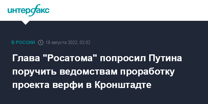 Москва. 19 августа. INTERFAX.RU - Глава госкорпорации "Росатом" Алексей Лихачев в рамках совещания по развитию судостроения в четверг попросил президента РФ Владимира Путина дать поручение ведомствам до декабря 2022 года проработать производственные, технологические и финансовые вопросы реализации проекта по строительству новой крупнотоннажной верфи в Кронштадте.