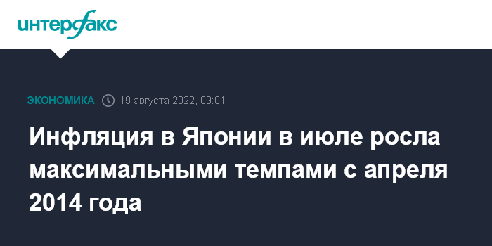 Москва. 19 августа. INTERFAX.RU - В июле 2022 года потребительские цены в Японии выросли на 2,6% по сравнению с июлем 2021 года, сообщило Министерство внутренних дел и коммуникаций страны.
