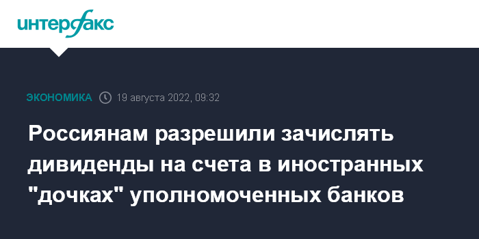 Москва. 19 августа. INTERFAX.RU - Граждане-резиденты России смогут зачислять дивиденды и отчисления из прибыли отечественных обществ с ограниченной ответственностью, хозяйственных товариществ и производственных кооперативов, на счета в иностранных "дочках" уполномоченных банков.