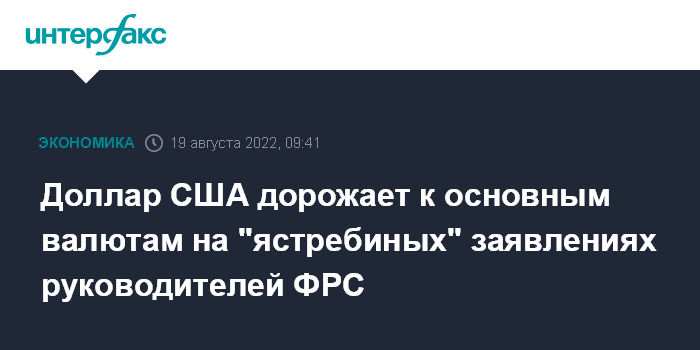 Москва. 19 августа. INTERFAX.RU - Курс доллара укрепляется к основным валютам в пятницу утром после "ястребиных" заявлений руководителей Федеральной резервной системы США.