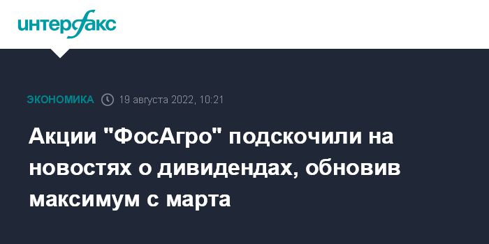 Москва. 19 августа. INTERFAX.RU - Акции "ФосАгро" на старте торгов в пятницу подскочили более чем на 7% после известий, что совет директоров рекомендовал внеочередному собранию акционеров принять решение о выплате дивидендов в размере 780 рублей на обыкновенную акцию.