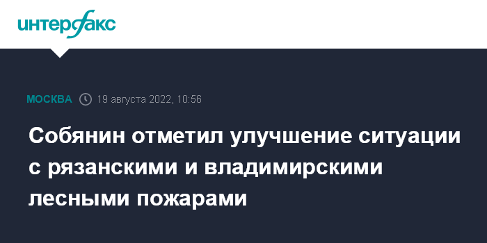 Москва. 19 августа. INTERFAX.RU - Мэр Москвы Сергей Собянин отметил, что несколько улучшилась си туация с лесными пожарами в Рязанской и Владимирской областях, дым от которых в последние дни доходил до столицы.