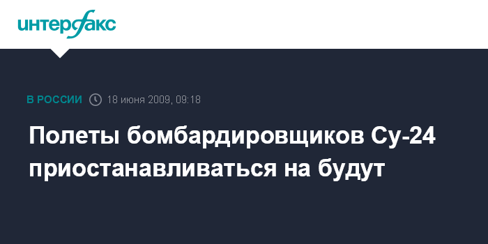 Москва. 18 июня. INTERFAX.RU - В Военно-воздушных силах России полеты фронтовых бомбардировщиков Су-24 приостанавливаться не будут в связи с аварией самолета данного типа в Мурманской области, заявил "Интерфаксу-АВН" представитель Минобороны РФ.