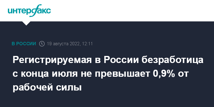 Регистрируемая в России безработица с конца июля не превышает 0,9% от рабочей силы