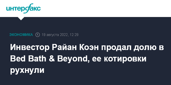 Москва. 19 августа. INTERFAX.RU - Известный инвестор-миллиардер Райан Коэн продал весь принадлежащий ему пакет акций Bed Bath & Beyond, владеющей сетью магазинов товаров для дома, прибыль от продажи превысила $58 млн.