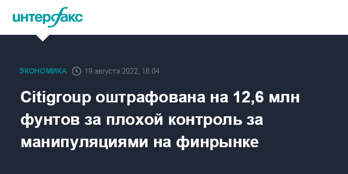 Москва. 19 августа. INTERFAX.RU - Citigroup Global Markets выплатит 12,6 млн фунтов стерлингов ($14,9 млн) в Великобритании в связи с тем, что компания не смогла надлежащим образом организовать выполнение требований по выявлению случаев рыночных махинаций
