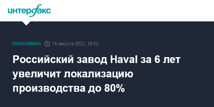 Москва. 19 августа. INTERFAX.RU - Автомобильный завод Haval (бренд китайской Great Wall Motor) в Тульской области планирует в течение шести лет локализовать в России более 80% производства, сообщила пресс-служба регионального правительства после визита в область вице-премьера - главы Минпромторга Дениса Мантурова.