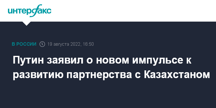 Москва. 19 августа. INTERFAX.RU - Встреча на высшем уровне придает дополнительный импульс развитию стратегического партнерства России и Казахстана, заявил президент РФ Владимир Путин в начале беседы со своим казахстанским коллегой Касым-Жомартом Токаевым.