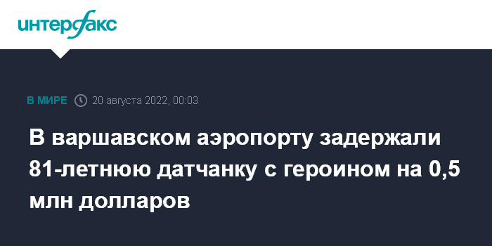 Москва. 19 августа. INTERFAX.RU - 81-летняя датчанка, путешествовавшая из Африки в Канаду, была арестована в аэропорту Варшавы по подозрению в незаконном хранении героина на сумму более 515 000 долларов США, сообщает в пятницу Associated Press со ссылкой на официальные польские источники.