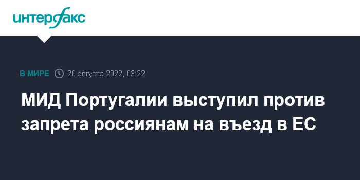 Москва. 20 августа. INTERFAX.RU - Португальское правительство заявило об отрицательном отношении к идее запрета на выдачу виз россиянам в Евросоюз. Об этом представитель Министерства иностранных дел Португалии сообщил газете Eco.