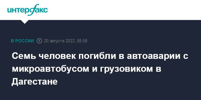 Москва. 20 августа. INTERFAX.RU - Автоавария с участием пассажирского микроавтобуса и грузовика произошла в Ногайском районе Дагестана, погибли семь человек, сообщает УГИБДД республики в своем телеграм-канале.
