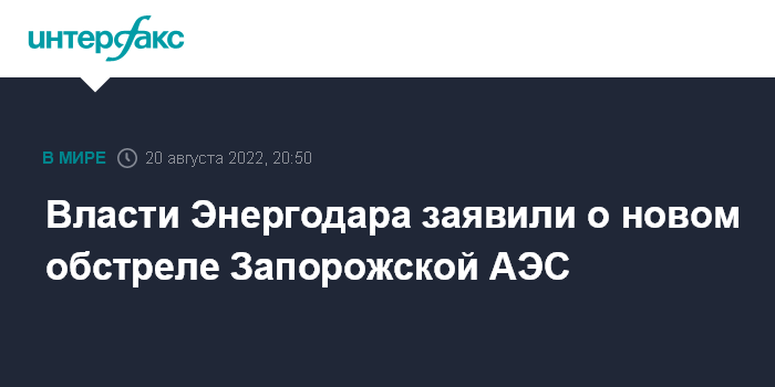 Москва. 20 августа. INTERFAX.RU - В пресс-службе администрации Энергодара заявили, что Вооруженные силы Украины нанесли в субботу артиллерийский удар по территории АЭС на подконтрольной РФ части Запорожской области.