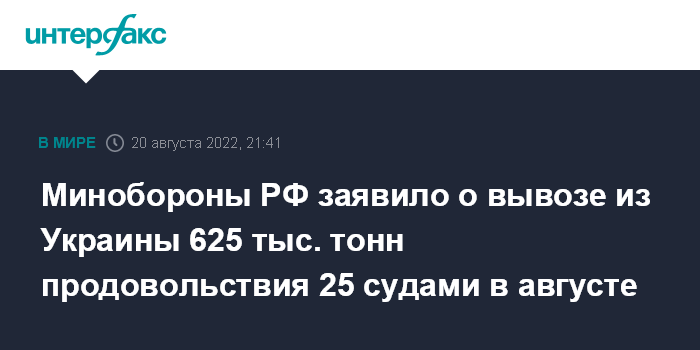 Минобороны РФ заявило о вывозе из Украины 625 тыс. тонн продовольствия 25 судами в августе