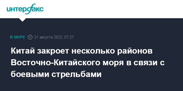 "Управление морской безопасности провинции Чжэцзян распространило навигационное предупреждение. С 2:00 до 16:00 22 августа в некоторых районах Восточно-Китайского моря будут проводиться боевые стрельбы, судоходство запрещено", - говорится на сайте ведомства.