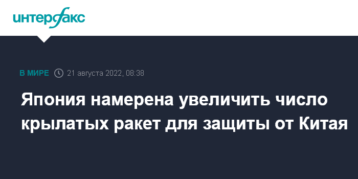 Москва. 21 августа. INTERFAX.RU - Япония рассматривает возможность увеличения своего арсенала крылатых ракет большой дальности до 1 тыс. штук, чтобы повысить потенциал на случай необходимых контратак против Китая, сообщила в воскресенье газета Yomiuri со ссылкой на правительственные источники.