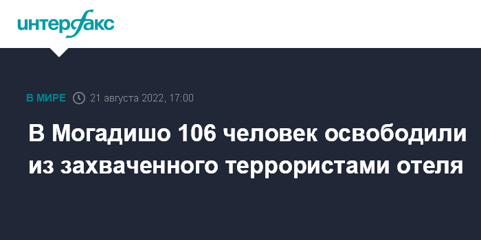 Москва. 21 августа. INTERFAX.RU - Силы безопасности Сомали освободили из захваченного боевиками отеля Hayat в столице страны Могадишо 106 человек, включая женщин и детей, сообщает в воскресенье телеканал "Аль-Арабийя".