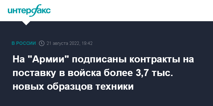 Москва. 21 августа. INTERFAX.RU - Почти четыре тысячи новых образцов техники поступит в Вооруженные силы РФ по контрактам, которые заключены на военно-техническом форуме "Армия-2022", сообщили в Минобороны РФ в воскресенье.