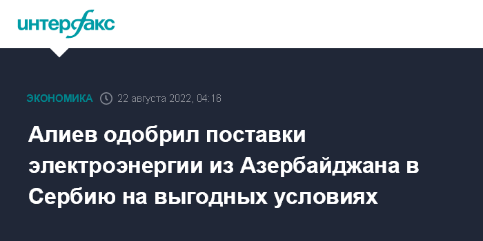 Москва. 22 августа. INTERFAX.RU - Сербия сможет на выгодных условиях покупать электроэнергию у Азербайджана, заявили в канцелярии главы сербского государства Александра Вучича по итогам воскресного телефонного разговора с президентом Азербайджана Ильхамом Алиевым.