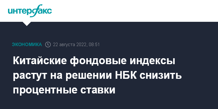 Москва. 22 августа. INTERFAX.RU - Китайские фондовые индексы растут на новости о снижении процентных ставок Народным банком КНР. Остальные рынки акций крупнейших государств Азиатско-Тихоокеанского региона (АТР) падают.