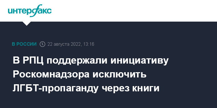Москва. 22 августа. INTERFAX.RU - В Русской православной церкви приветствовали обращение Роскомнадзора в Российский книжный союз с просьбой исключить распространение книг с пропагандой ЛГБТ.