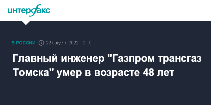 Москва. 22 августа. INTERFAX.RU - Главный инженер - первый заместитель гендиректора ООО "Газпром трансгаз Томск" Александр Лун-Фу скончался на 49 году жизни, сообщили "Интерфаксу" в пресс-службе компании.