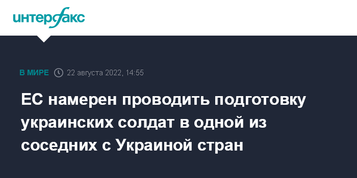 Москва. 22 августа. INTERFAX.RU - ЕС намерен разместить миссию по подготовке украинских военных в соседней с Украиной стране, сообщил в понедельник глава европейской дипломатии Жозеп Боррель на пресс-конференции в испанском городе Сантандер.