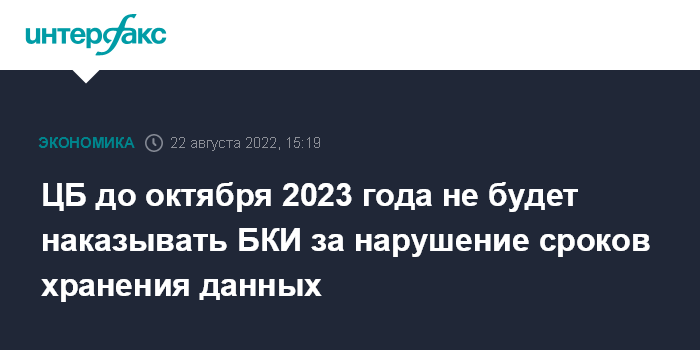 Москва. 22 августа. INTERFAX.RU - Банк России до 1 октября 2023 года не будет применять меры за нарушение требований к срокам хранения согласий на использование кредитной истории и кредитных отчетов, предоставляемых пользователям кредитных историй, если обязанность по их хранению возникла у бюро кредитных историй начиная с 1 января 2021 года и они хранятся в бюро не менее одного года.