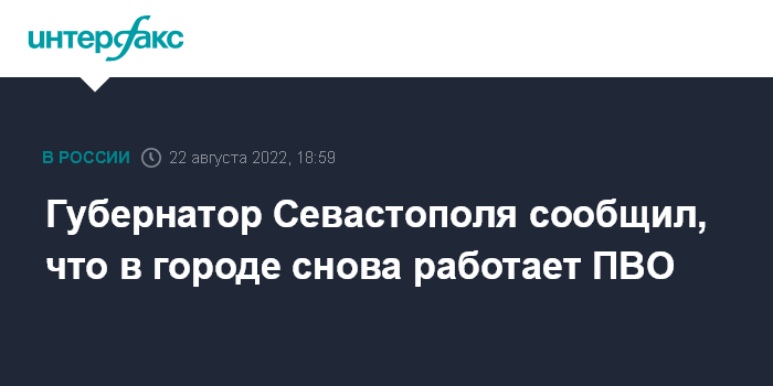 Москва. 22 августа. INTERFAX.RU - Система противовоздушной обороны отработала в понедельник вечером в Севастополе, по предварительным данным, сбит беспилотник, сообщил губернатор города Михаил Развожаев.