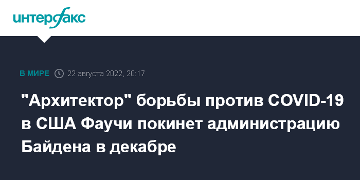 Москва. 22 августа. INTERFAX.RU - Высокопоставленный советник президента США по борьбе с пандемией коронавируса COVID-19 Энтони Фаучи уйдет из администрации Джо Байдена в декабре, пишет в понедельник газета The Hill.