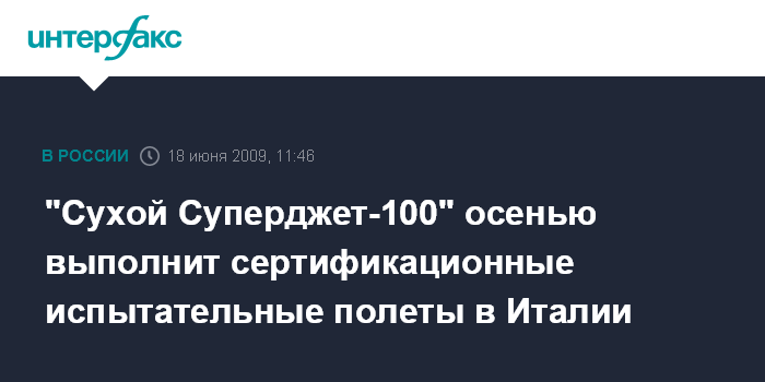 Москва. 18 июня. INTERFAX.RU - Испытательные полеты самолета "Сухой Суперджет-100" в рамках сертификации по европейским нормам летной годности будут выполнены в Италии осенью 2009 года, заявил "Интерфаксу-АВН" в Ле Бурже генеральный директор компании Superjet International Алессандро Франзони.