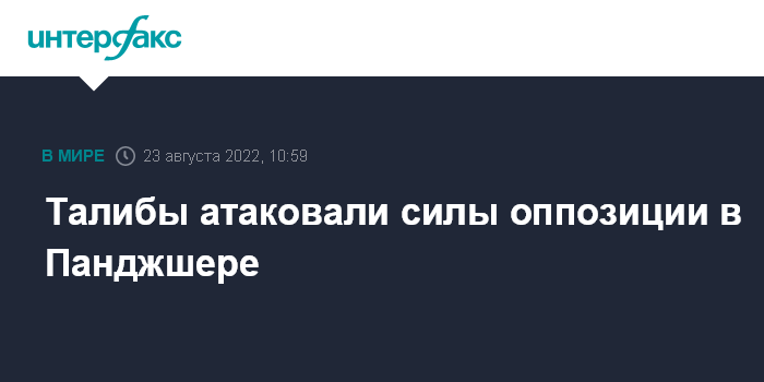 Москва. 23 августа. INTERFAX.RU - Силы движения "Талибан" (запрещенная в России террористическая организация) атаковали в ночь на вторник подразделения антиталибовского Фронта национального сопротивления в Панджшере, есть убитые, сообщают местные СМИ.