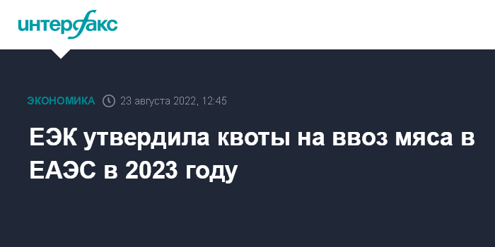 Москва. 23 августа. INTERFAX.RU - Евразийская экономическая комиссия (ЕЭК) установила тарифные квоты в отношении импорта ряда видов мясной продукции и молочной сыворотки на 2023 год, сообщил торговый блок комиссии. Для всех стран, кроме Армении, квоты остались на уровне прошлого года.