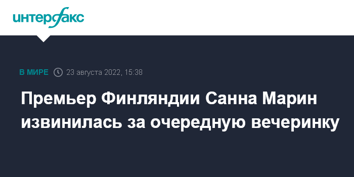 Москва. 23 августа. INTERFAX.RU - Премьер-министру Финляндии Санне Марин (Sanna Marin) пришлось вновь извиняться за вечеринку, проведенную на сей раз в резиденции правительства.