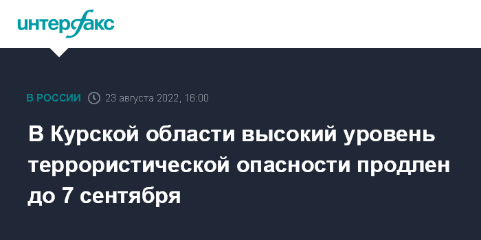 Москва. 23 августа. INTERFAX.RU - Губернатор Курской области Роман Старовойт сообщил о продлении действующего в регионе "желтого" (высокого) уровня террористической опасности еще на 15 дней, до 7 сентября.