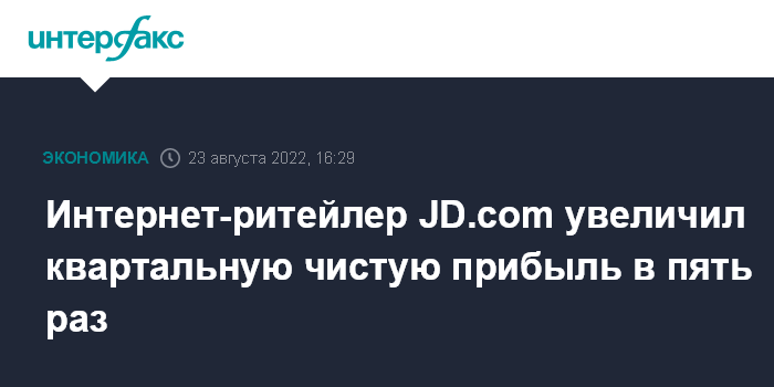 Москва. 23 августа. INTERFAX.RU - Во II квартале 2022 года китайский интернет-ритейлер JD.com Inc. увеличил чистую прибыль более чем в пять раз, выручку - на 5,4%.