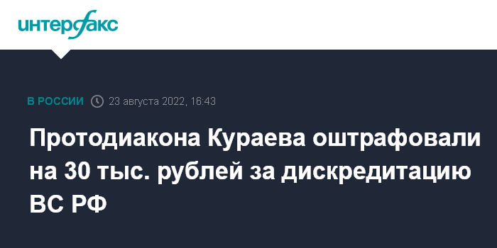 Москва. 23 августа. INTERFAX.RU - Никулинский суд Москвы назначил запрещенному в служении протодиакону Андрею Кураеву штраф в размере 30 тысяч рублей за дискредитацию Вооруженных сил России, сообщили "Интерфаксу" во вторник в суде.