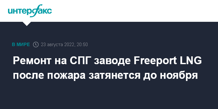 Москва. 23 августа. INTERFAX.RU - Американский завод СПГ Freeport LNG сообщил о новой задержке в ходе ремонтных работ после пожара: если раньше компания планировала возобновить полноценную деятельность в начале октября, то теперь речь идет о начале-середине ноября, заявила Freeport LNG Development, L.P.