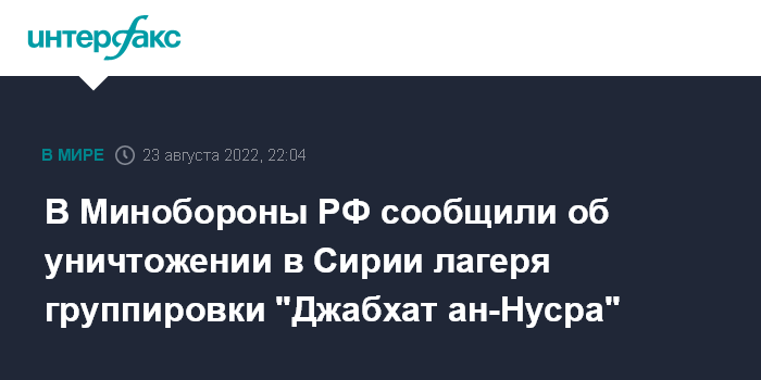 Москва. 23 августа. INTERFAX.RU - В Минобороны России сообщили об уничтожении в Сирии штаба боевиков "Джабхат ан-Нусра" (террористическая группировка, запрещена в РФ).