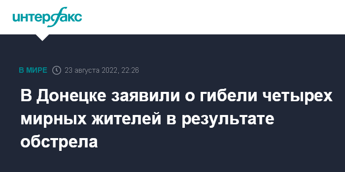 Москва. 23 августа. INTERFAX.RU - Четверо мирных жителей погибли, еще 11 пострадали в результате обстрела центральной части Донецка во вторник, сообщил мэр города Алексей Кулемзин.