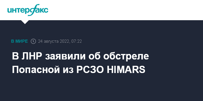 Москва. 24 августа. INTERFAX.RU - Украинские военные выпустили по подконтрольному ЛНР городу Попасная две ракеты из американских реактивных систем залпового огня "HIMARS", сообщает представительство республики в Совместном центре по контролю и координации режима прекращения огня (СЦКК).
