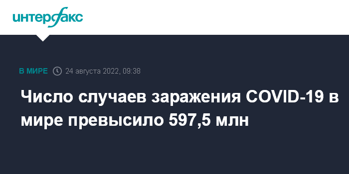 Москва. 24 августа. INTERFAX.RU - Число подтвержденных случаев заражения коронавирусом в мире на утро среды достигло 597 675 219, свидетельствуют данные американского университета Джонса Хопкинса.